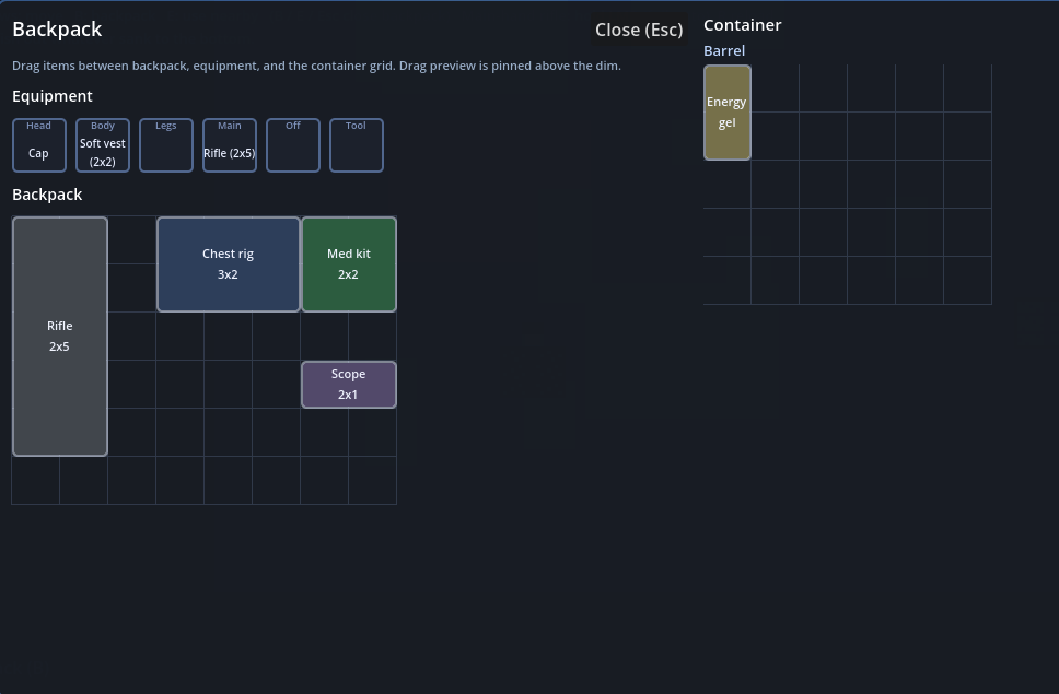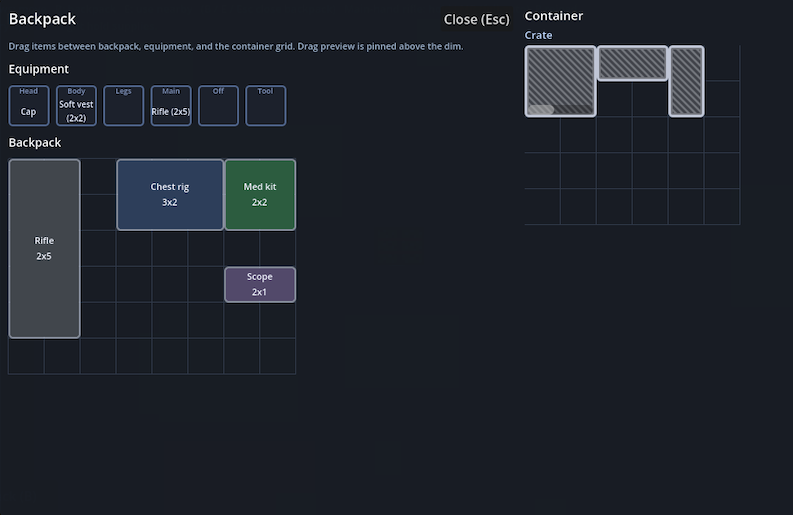 - Grid inventory — Drag between backpack, equipment slots, and the container panel; items have footprints (1×1, 2×2, etc.).