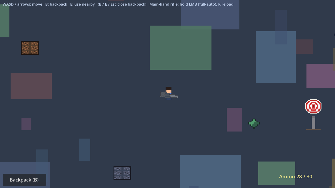 - Shooting range — Paper targets take damage; ammo HUD, full-auto cadence, optional auto-reload when you release the fire button on an empty mag.
